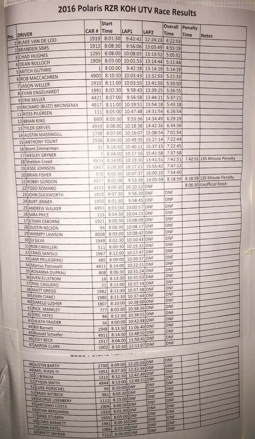 Race Day Results from 2016 UTV King of The Hammers