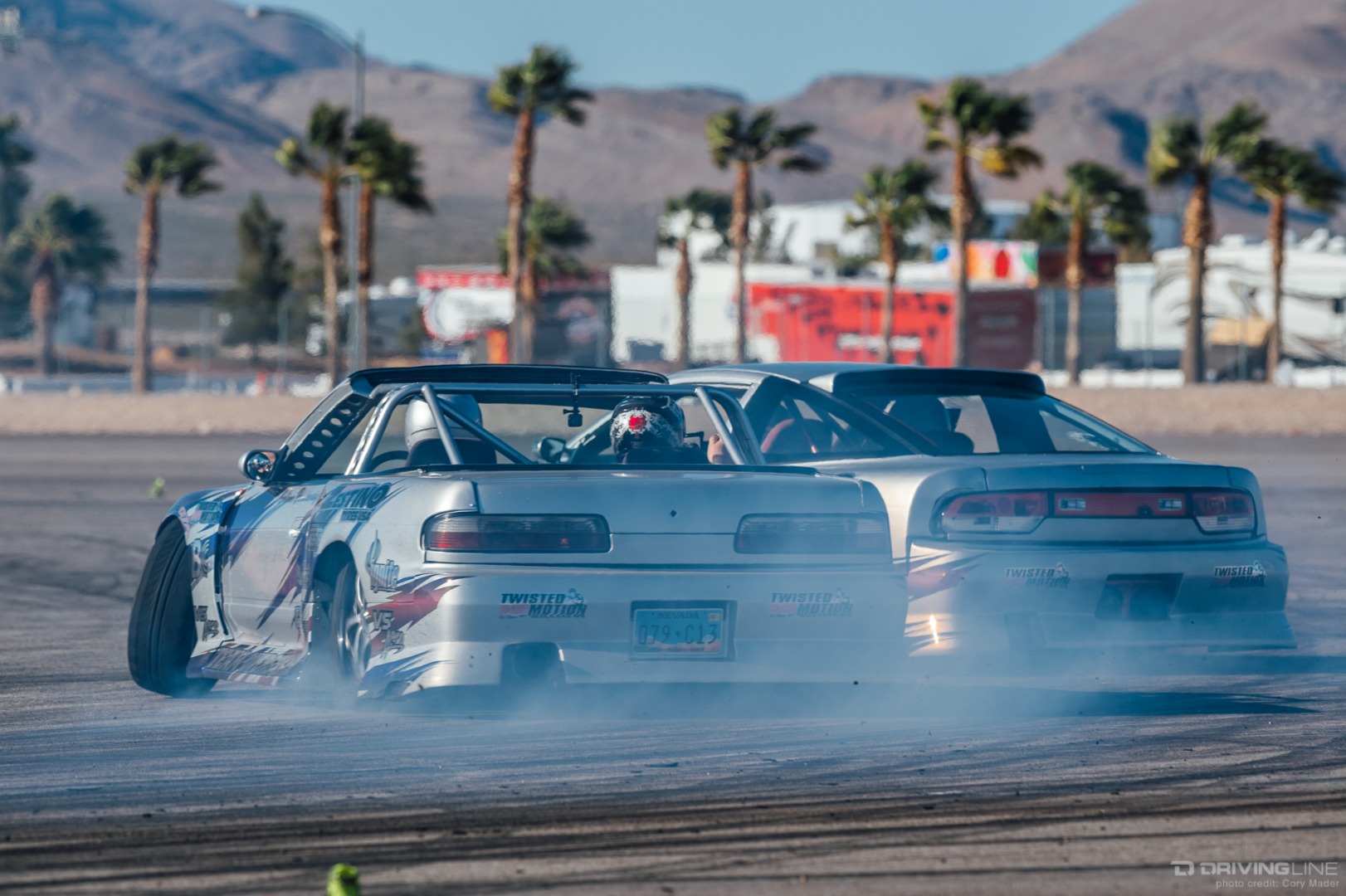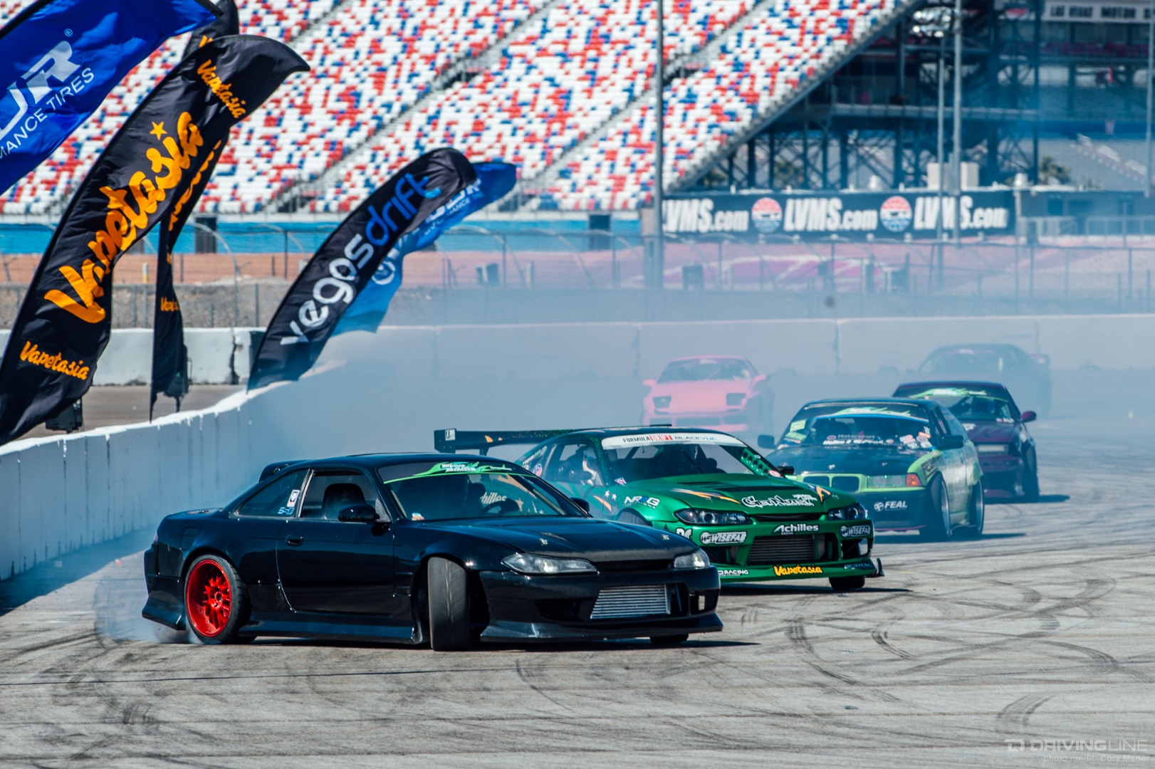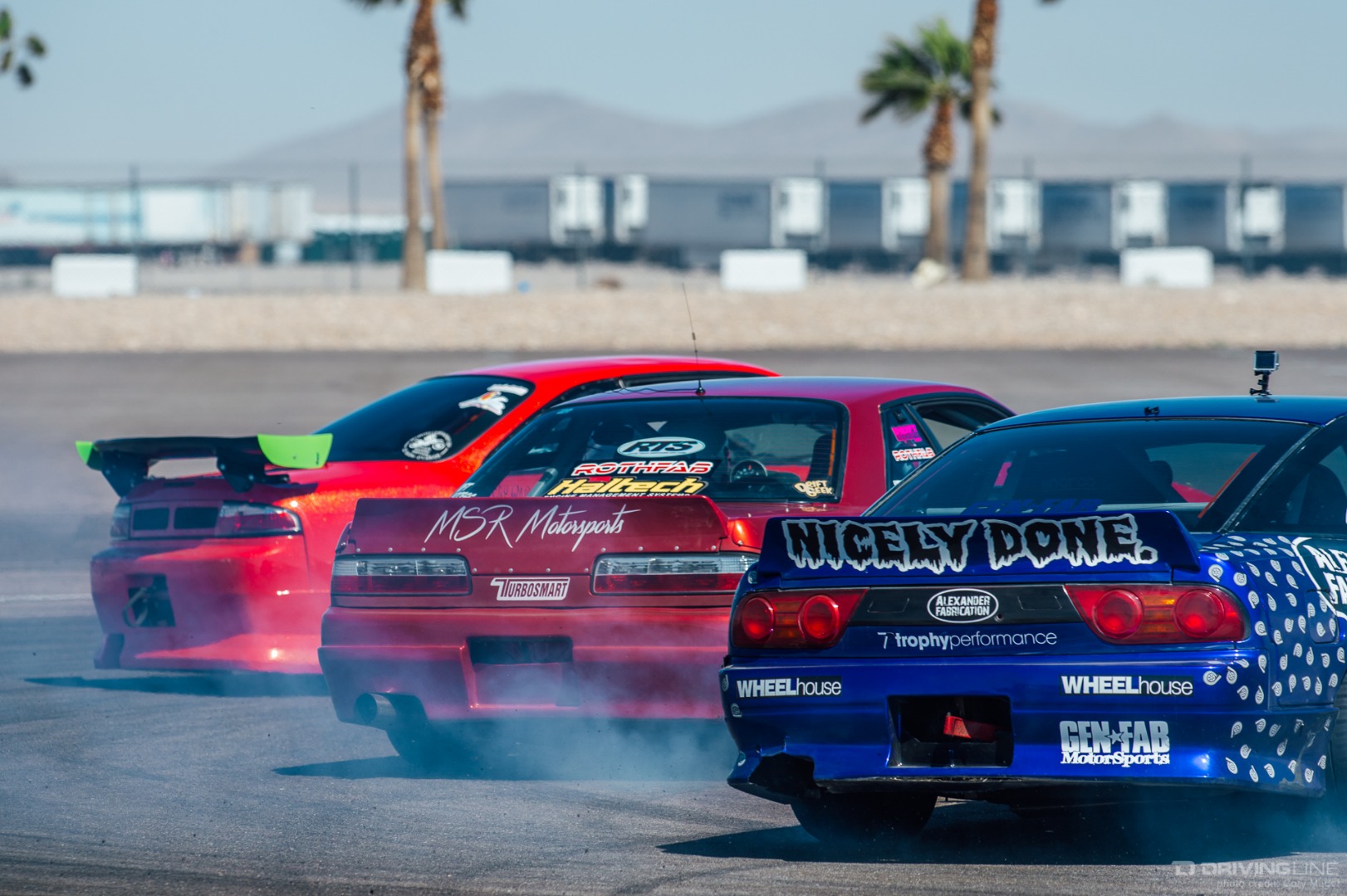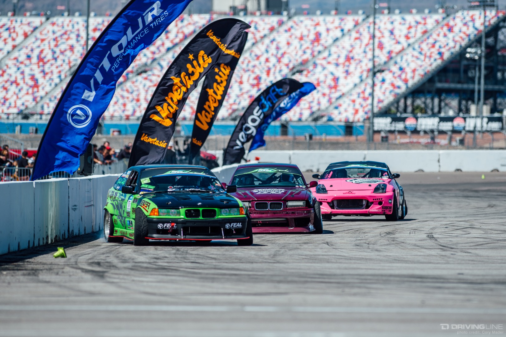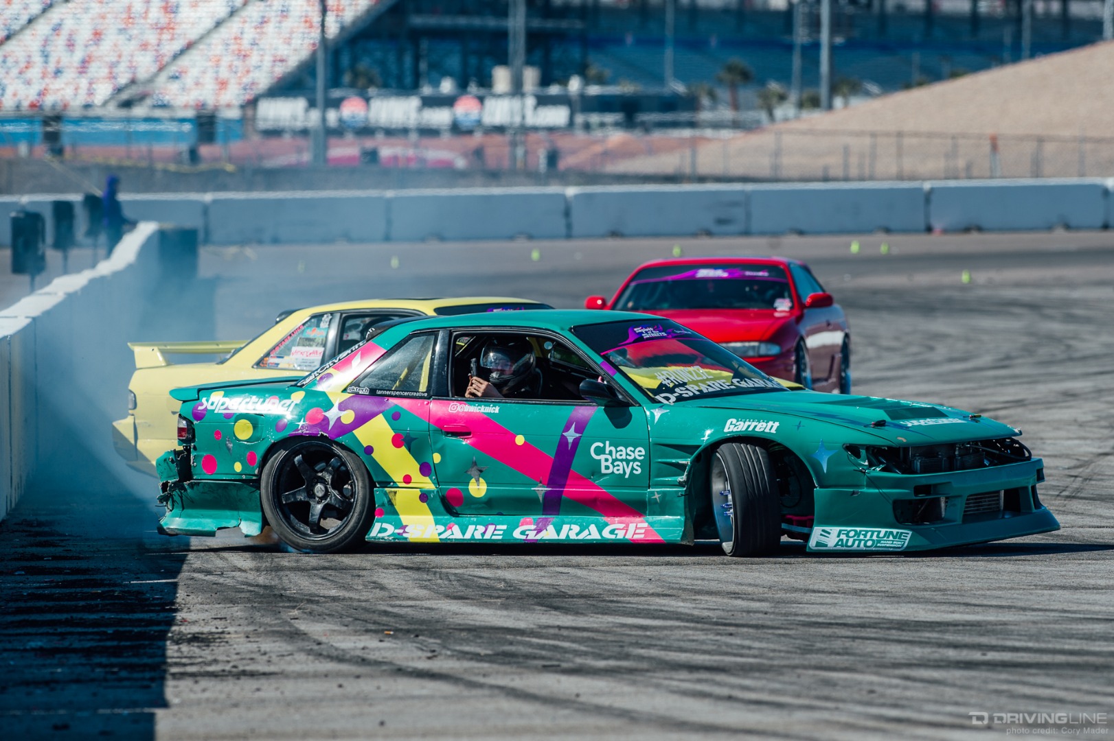 As the weekend continued, drivers got progressively more comfortable, upping the ante with increasingly longer trains and slamming together tight tandems through the technical turns with ease. Luckily, nobody completely cashed in their chips before shredding through Day 2 of the event—paint scuffs, a couple lost bumpers and some totaled tires were all Tamada claimed. Let's be honest, a trip to Vegas usually costs a lot more!