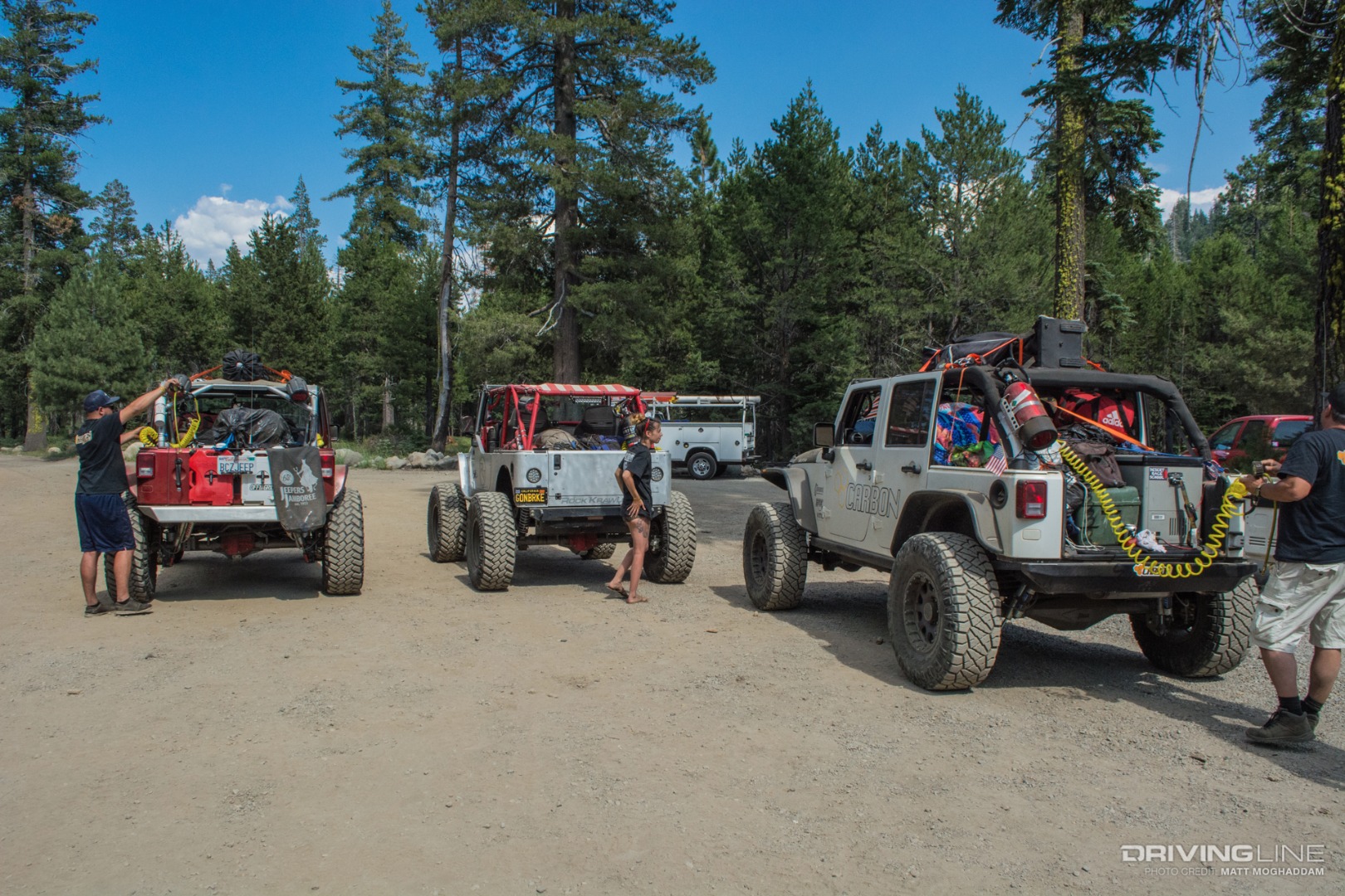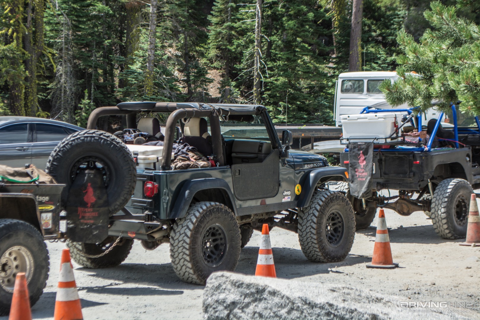 This year the trip attracted over 1,500 attendees and hundreds of vehicles. As always, Jeepers Jamboree provided freshly cooked meals for the days at Rubicon Springs, made possible by a group of volunteers from the American Legion Post 119. I hopped in with the Stobaugh family, owners of Off Road Brands, and veterans of the Jeepers Jamboree trail. Their stable included Austin's red Rubicon Tested JKU, Ron's white Carbon JKU and Courtney's freshly built stretched TJ.