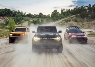Aimed heavily at off-road enthusiasts, the Bronco comes equipped with a variety of trail-ready equipment. 4WD is standard across the line, and along with a heavy focus on crucial specs like ground clearance and approach/depature angles—the Bronco is available with a number of off-road tricks. Locking differentials, an advanced transfer case option, skid plates and terrain select options.